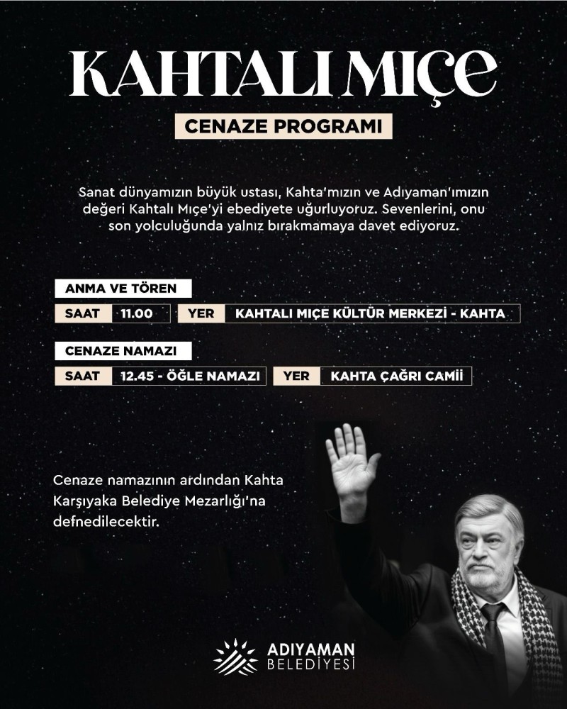 “Sanat dünyamızın büyük ustası, Adıyaman’ımızın kültür elçisi Kahtalı Mıçe’yi ebediyete uğurluyoruz. Sevenlerini, onu son yolculuğunda yalnız bırakmamaya davet ediyoruz.”